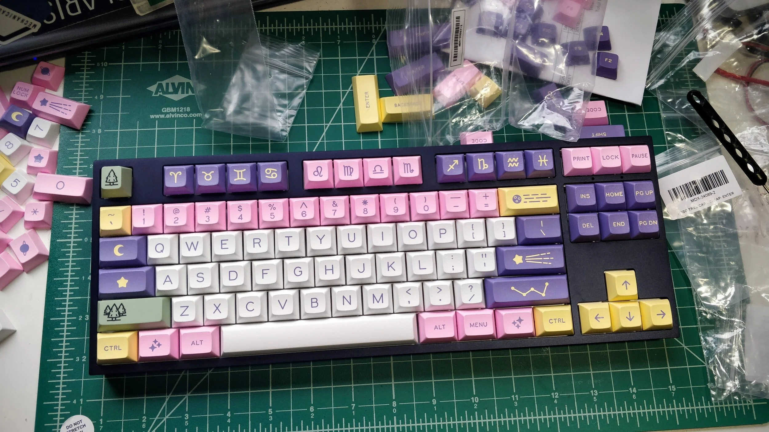 A custom mechanical keyboard with pastel pink, purple, white, and yellow keycaps on a green cutting mat, surrounded by additional unused keycaps and tools.