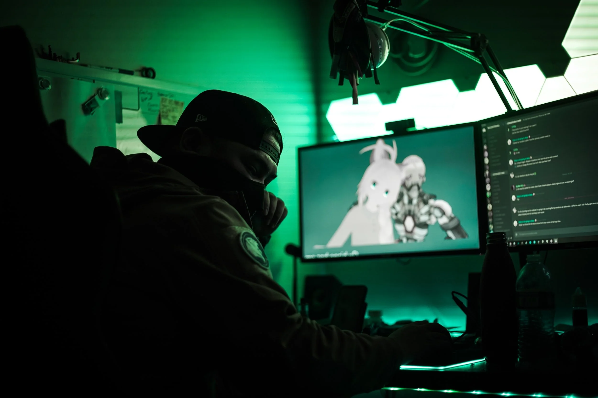 A person wearing a cap and face mask, sitting in front of two computer monitors, one displaying anime-style characters and the other showing a chat or messaging app, in a dimly lit room with green lighting.